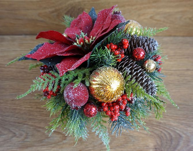 Košíky plnené bobuľami. Môžu byť buď prútené, alebo vyrobené z vlastnej lepenky. V košíku musíte dať bobule horského popola, kalina, pridať smrekové vetvy, borovice a šišky. Tieto koše je možné umiestniť okolo domu. Budú z nich dýchať novoročná vôňa a stanú sa nádherným dekoračným prvkom.