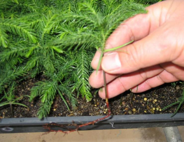 Keď korene odrezkov vyrastú a stiesnia sa, presaďte každý z nich do veľkého hrnca. V takom prípade môžete vziať substrát, ktorý sa použil na výsadbu dospelej rastliny (o príprave pôdnej zmesi pre zrelú araukariu sa hovorí vyššie).