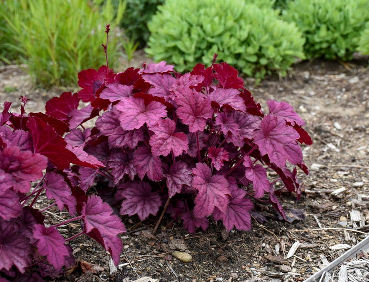 Heuchera vytvára malé kríky vysoké nie viac ako pol metra. Táto rastlina môže kvitnúť celkom elegantne, ale hlavným znakom heuchery je jej veľká a krásna zeleň. Počas rastu sa jeho farba môže niekoľkokrát meniť. Paleta farieb listových dosiek obsahuje veľa tónov žltej, zelenej, červenej a iných farieb, ako aj ich kombinácie.