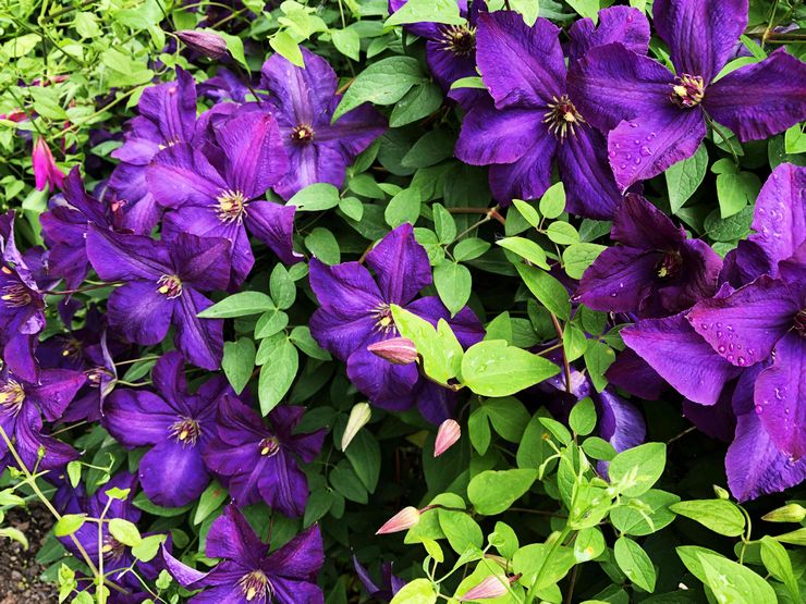 - Hviezda Indie - vegetačná hmota, držiaca sa podpory, stúpa nad zemou na úrovni troch metrov. Kompozitné listové platne spomínaného kríkového typu majú 3 - 5 celých alebo laločnatých oválnych listov so zahrotenými okrajmi. Stredne veľké púčiky zdobia rastlinu od polovice do konca leta a dorastajú až do priemeru 15 cm. Odroda má jasnú fialovú farbu. Stredom kalicha prechádza fialový pruh. Tyčinky svetlej farby.