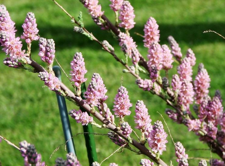Počas obdobia kvitnutia sa na kríkoch objavujú púčiky s dlhými listeňmi. Zbierajú sa v apikálnych alebo bočných kvetenstvách: kefy, laty alebo klásky. Takéto kvetenstvo sa uchováva na stopkách dlhých až 40 cm, farba okvetných lístkov je lila alebo ružová. Každá kvetina vydrží na rastline až 5 dní. Kvitnutie začína v druhej polovici mája a môže trvať pár mesiacov kvôli postupnému kvitnutiu pukov. Kvety sa začínajú objavovať od spodnej časti konárov a ku koncu leta kvitnú horné výhonky.