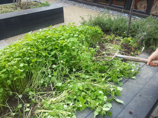 - Neodporúča sa porušovať celistvosť pôdy v záhradnom záhone kopaním, a to ešte viac spolu so zelenou hmotou. Všetky užitočné mikroorganizmy sa pri kopaní zničia a v zložení pôdy nastanú negatívne zmeny. Zelená časť rastliny by mala byť kosená alebo rezaná a použitá na mulčovanie alebo organické prísady.
